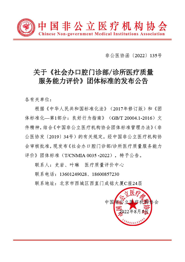 關于《社會辦口腔門診部/診所醫療質量服務能力評價》團體標準的發布公告
