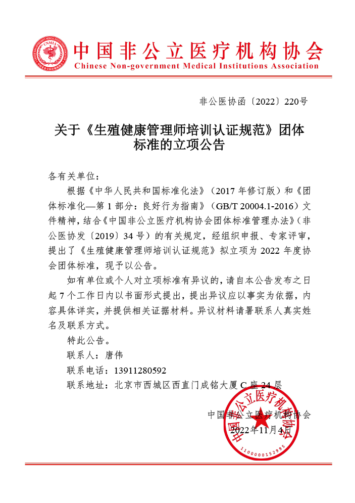 立項公告丨關(guān)于《生殖健康管理師培訓(xùn)認(rèn)證規(guī)范》團體標(biāo)準(zhǔn)的立項公告