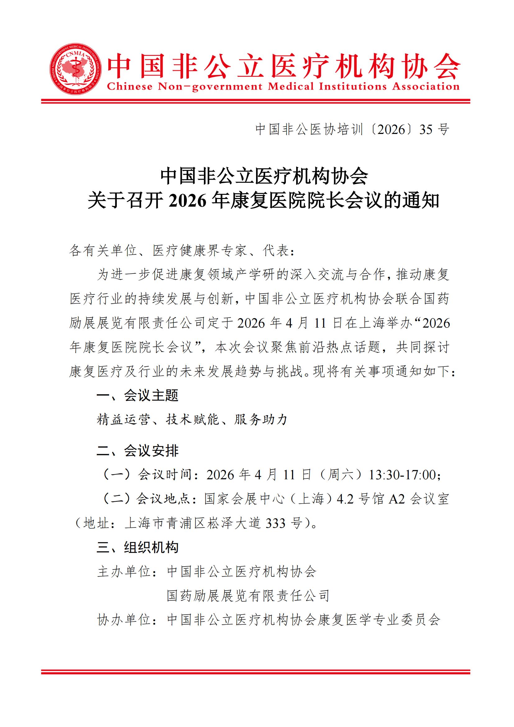 為進(jìn)一步促進(jìn)康復(fù)領(lǐng)域產(chǎn)學(xué)研的深入交流與合作,推動(dòng)康復(fù)醫(yī)療行業(yè)的持續(xù)發(fā)展與創(chuàng)新,中國(guó)非公立醫(yī)療機(jī)構(gòu)協(xié)會(huì)聯(lián)合國(guó)藥勵(lì)展展覽有限責(zé)任公司定于2026年4月11日在上海舉辦“2026年康復(fù)醫(yī)院院長(zhǎng)會(huì)議”,本次會(huì)議聚焦前沿?zé)狳c(diǎn)話題,共同探討康復(fù)醫(yī)療及行業(yè)的未來發(fā)展趨勢(shì)與挑戰(zhàn)。現(xiàn)將有關(guān)事項(xiàng)通知如下: